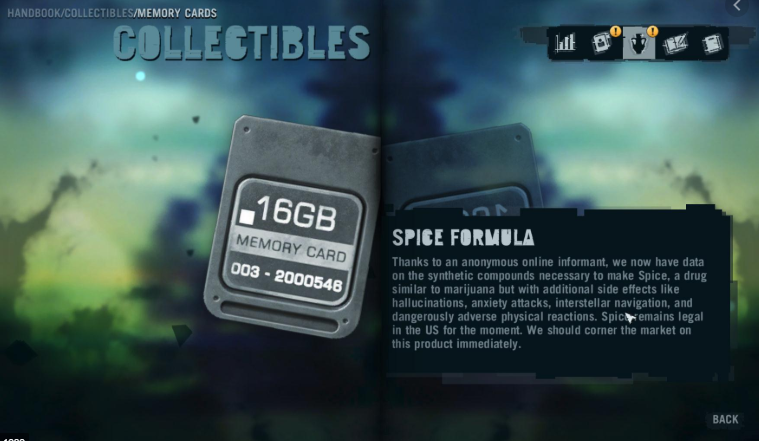 Por otra parte, una de estas ‘Tarjetas de memoria’ coleccionables contiene instrucciones para la sintetización de una droga llamada ‘Spice’, siendo uno de sus efectos secundarios el viaje interestelar, una propiedad que comparte con la droga llamada ‘Spice’ que aparece en el libro ‘Dune.