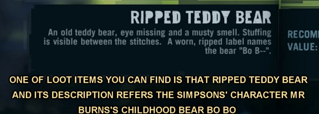 Muchos items hacen referencia a esta famosa serie, cabe destacar el osito de peluche rasgado en cuya etiqueta se puede leer «Bo B-«. Esta es una referencia al personaje de los Simpsons, Mr. Burns y el osito de peluche de su infancia.