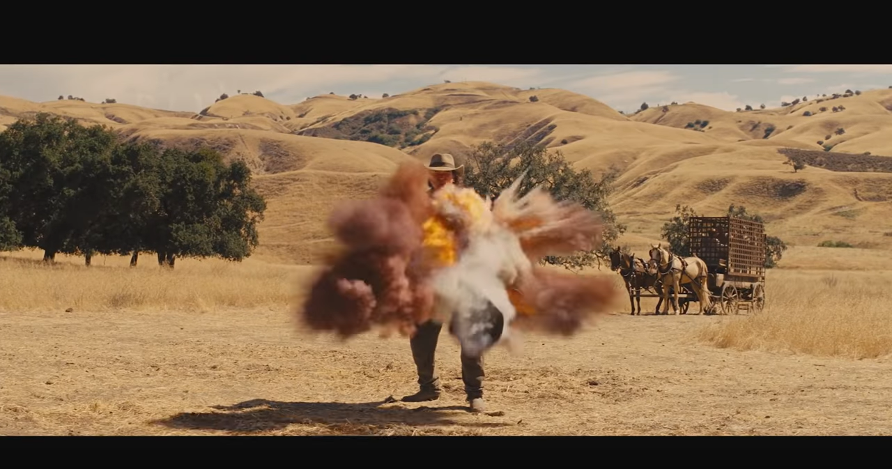 En este gran espacio abierto podremos encontrar un easter egg que hace referencia a la película de Quentin Tarantino. Este serian los cadáveres de los comerciantes de esclavos con lo que se encuentra Django al principio de la película. Los dos que mata de un disparo y el otro que explota al ir cargado de explosivos.